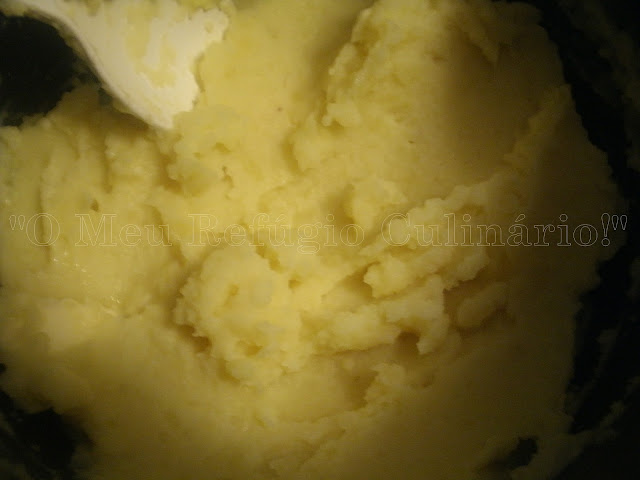 Depois de as batatas já estarem cozidas, coei e triturei a batata (reduzi a puré, com este acessório, que de seguida vos amostro).