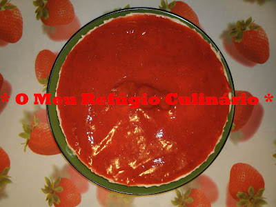 Deixe passar 5 minutos e cubra com doce à escolha (Eu fiz doce de morango caseiro. Tinha morangos congelados, que deixei a descongelar e coloquei-os num tachinho com um bocadinho de açúcar, áté ferver). Volte a colocar no frigorífico e deixe solidificar e arrefecer durante, pelo menos umas 4 horas.