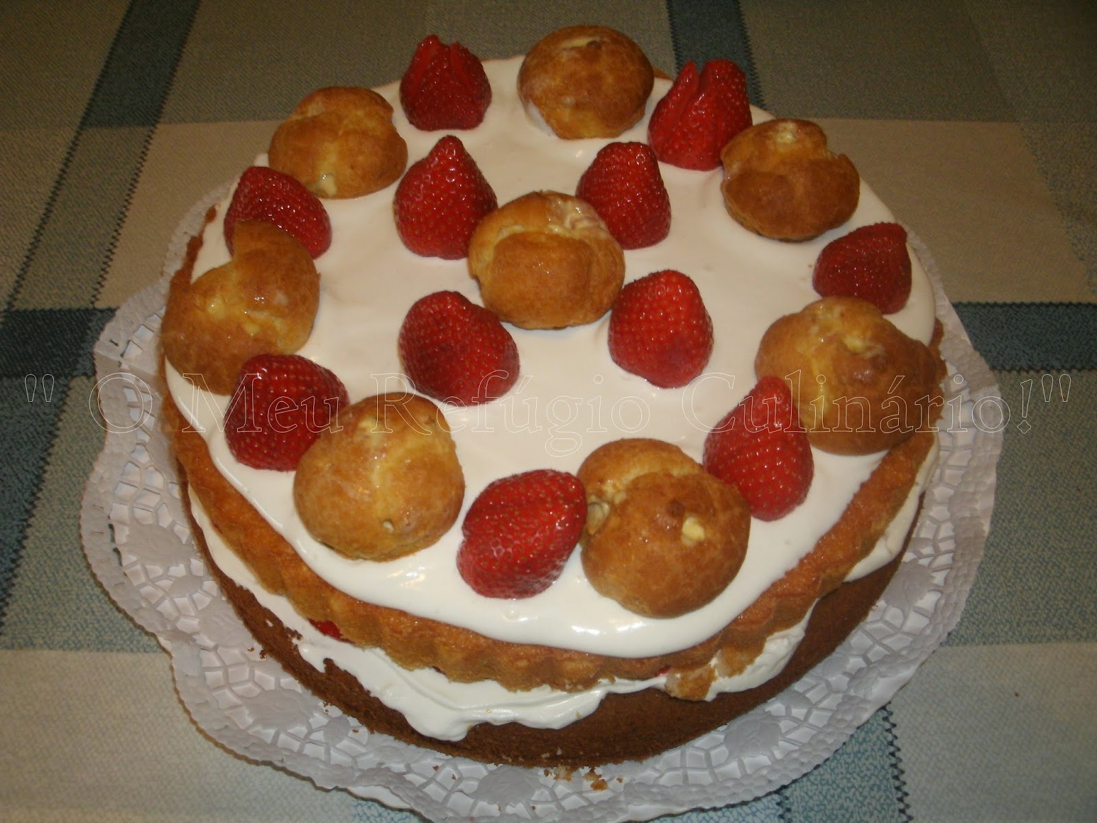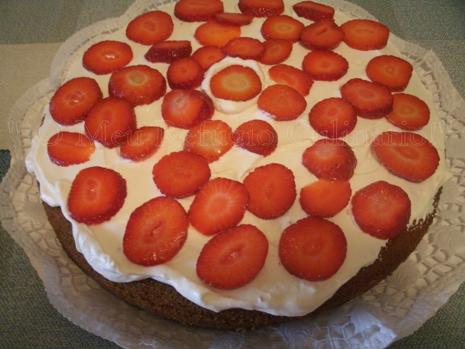 Coloquei o bolo de chocolate, num "napron". Cobri com natas montadas em chantily e puz morangos cortados por cima,.....