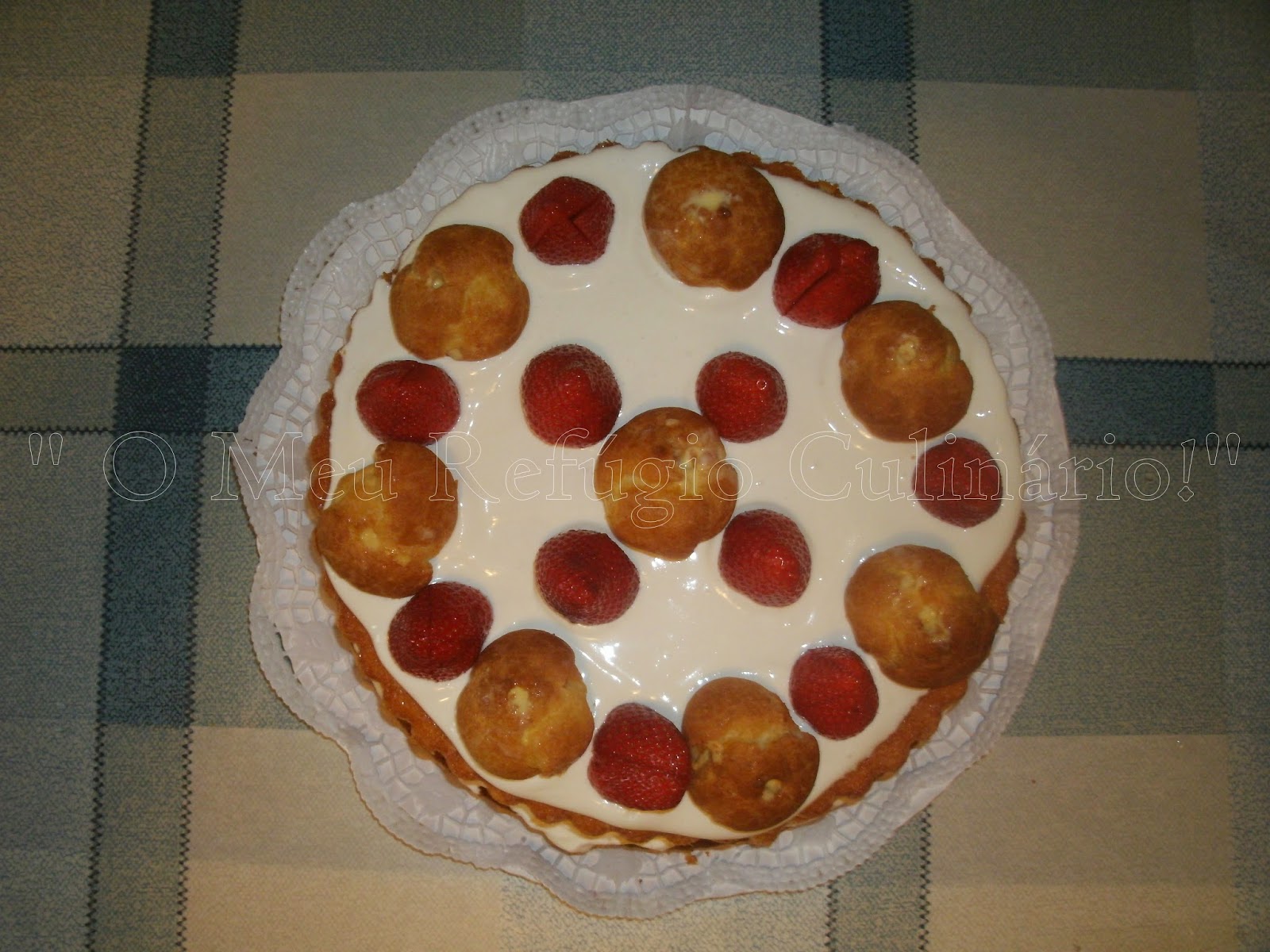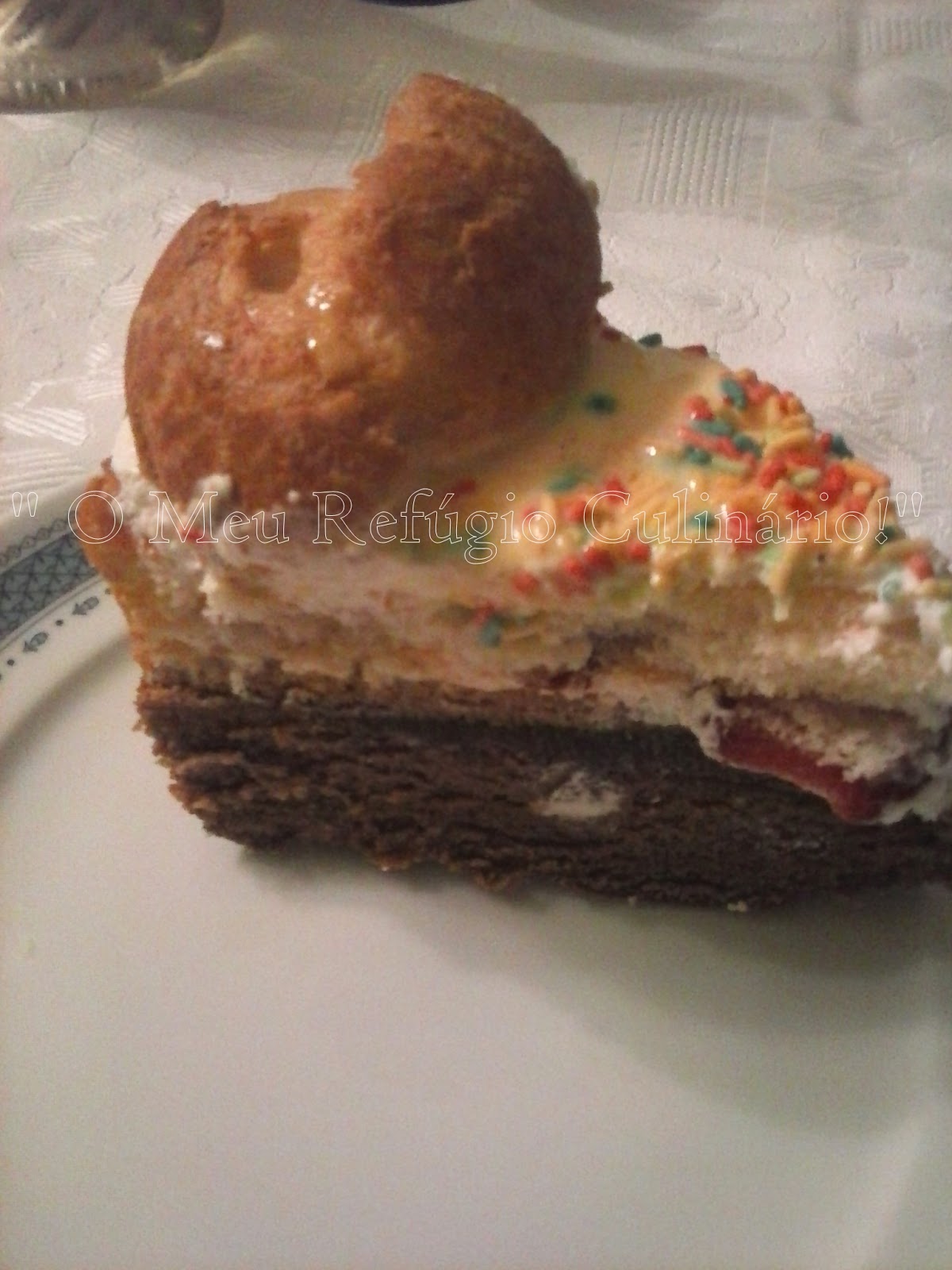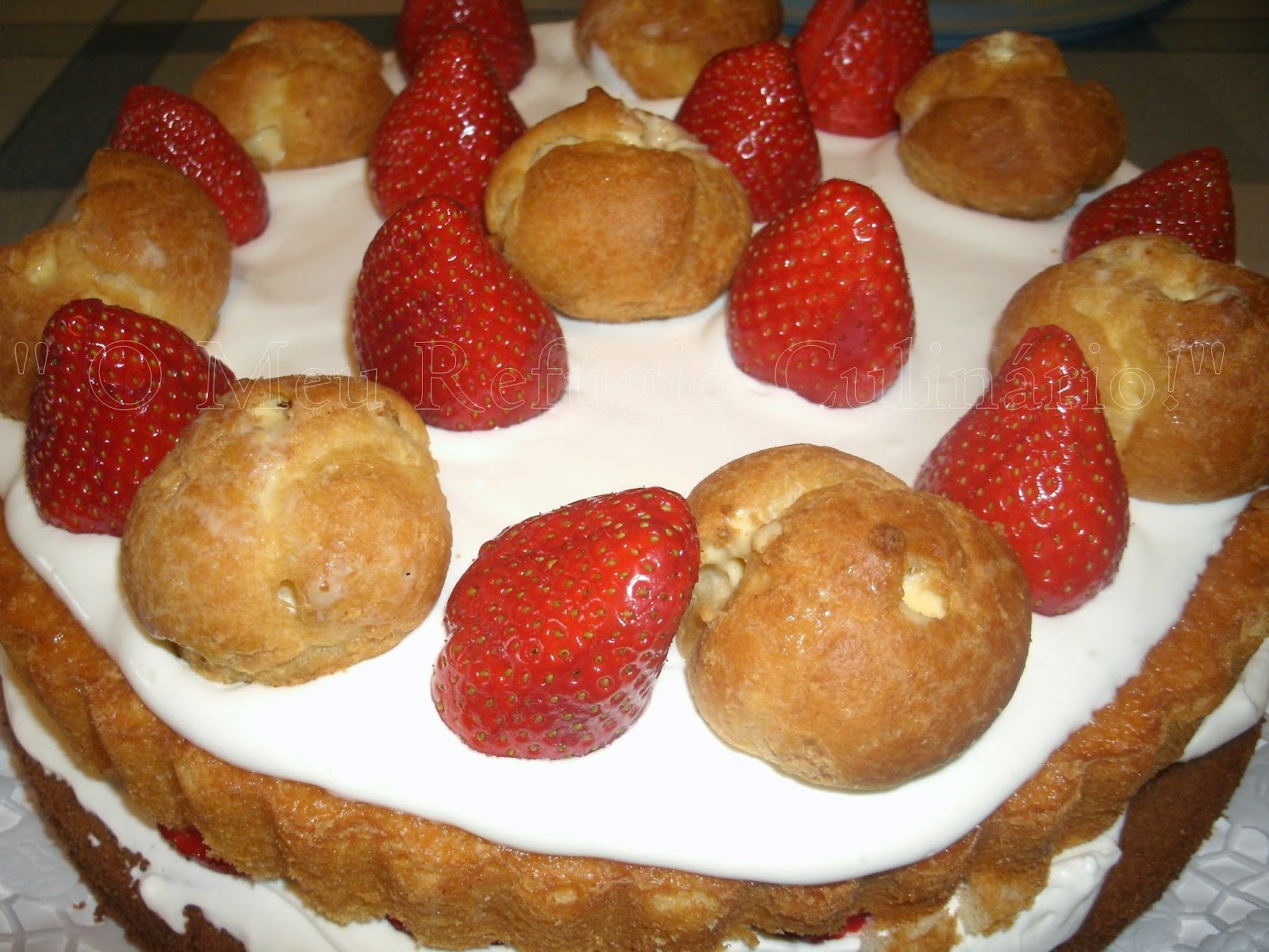 Fiz a decoração com profiteroles de compra e morangos,.....e no fim, coloquei uns confetis coloridos,....